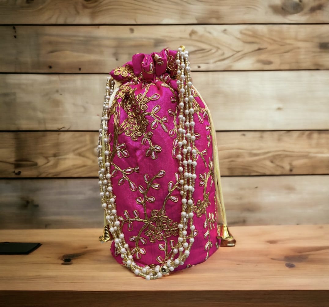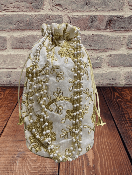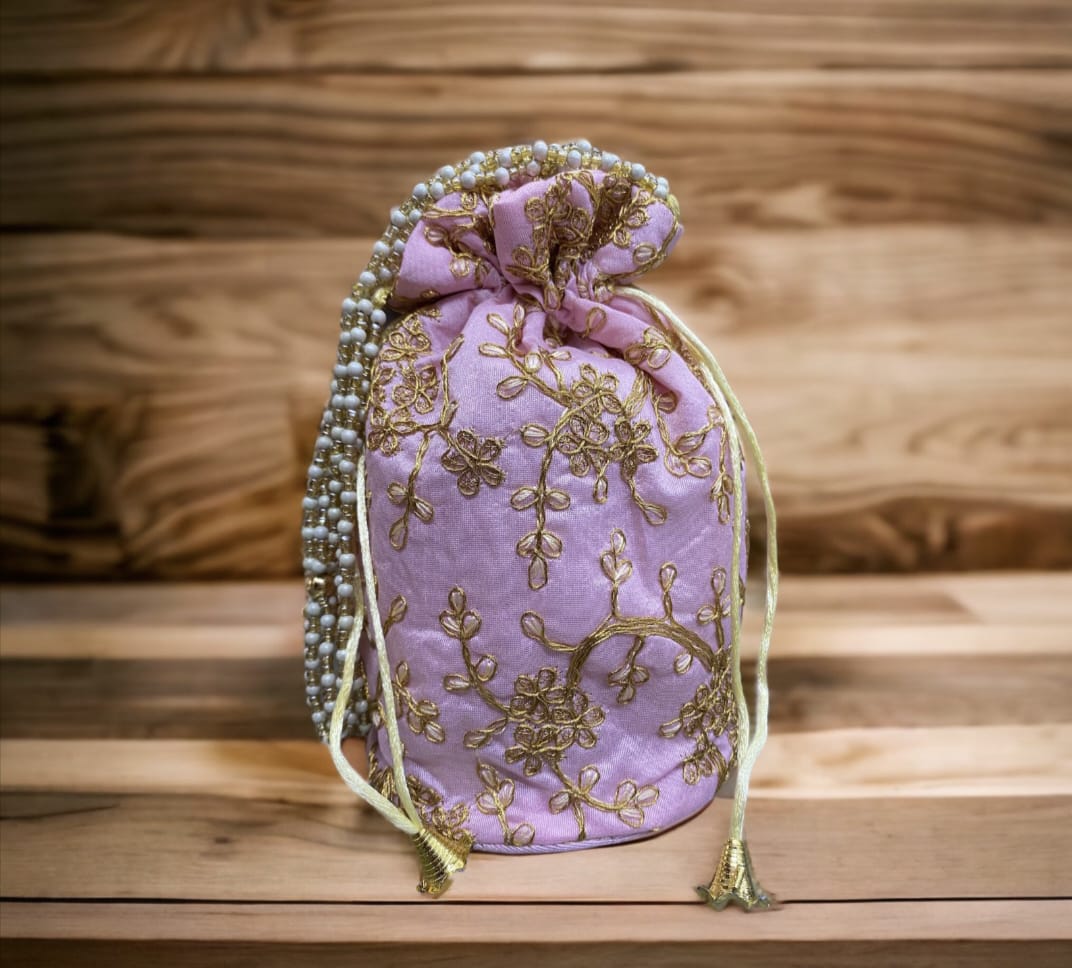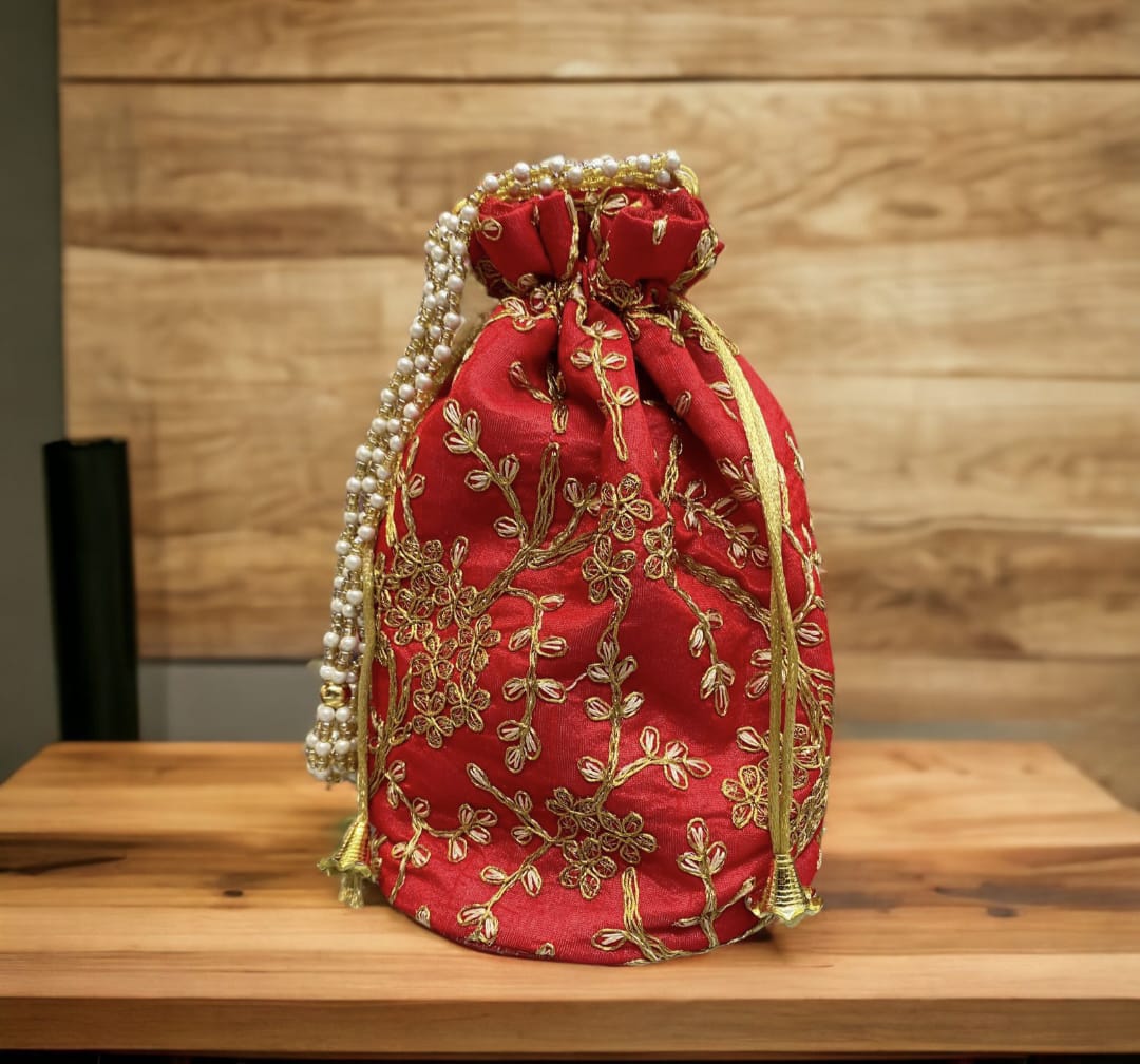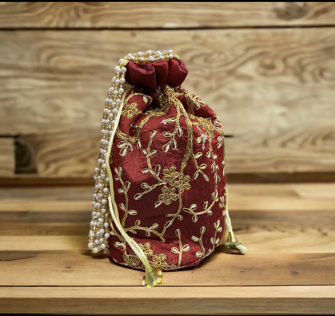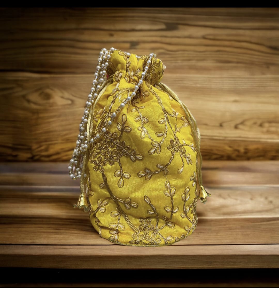 - Elegant potli bag with rich gold floral embroidery